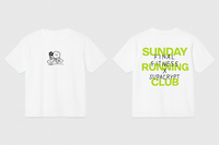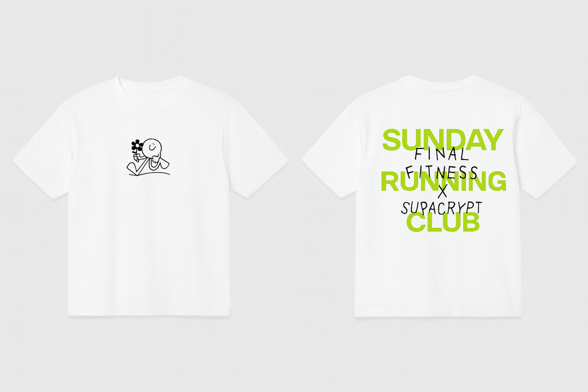 The front of the shirt features a playful, minimalist illustration that captures the joy of movement, while the bold back print highlights the spirit of the Sunday Running Club x Supacrypt collaboration. The design reflects both the fun and determination that made the event such a success.